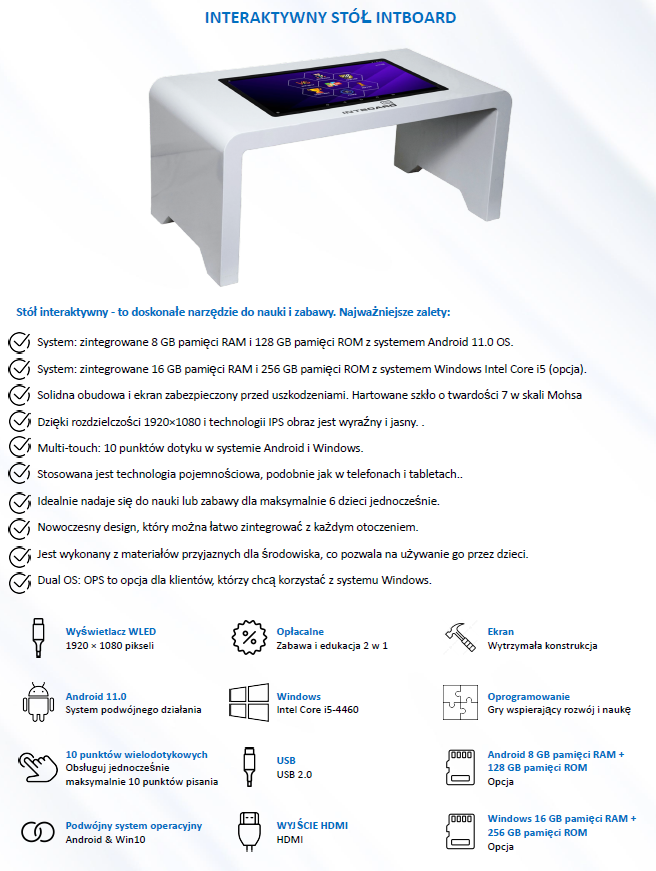Stół interaktywny dla dzieci INTBOARD STYLE to doskonałe narzędzie do nauki i zabawy, obsługujące jednocześnie maksymalnie 6 dzieci. Posiada jaskrawe kolory oraz jest wykonany z materiałów przyjaznych dla środowiska, co zapewnia bezpieczne użytkowanie przez najmłodszych. Ekran jest pokryty bezpiecznym szkłem hartowanym, nie wpływając negatywnie na jakość obrazu ani szybkość reakcji. Zastosowana technologia pojemnościowa, znana z telefonów i tabletów, gwarantuje precyzyjne działanie.